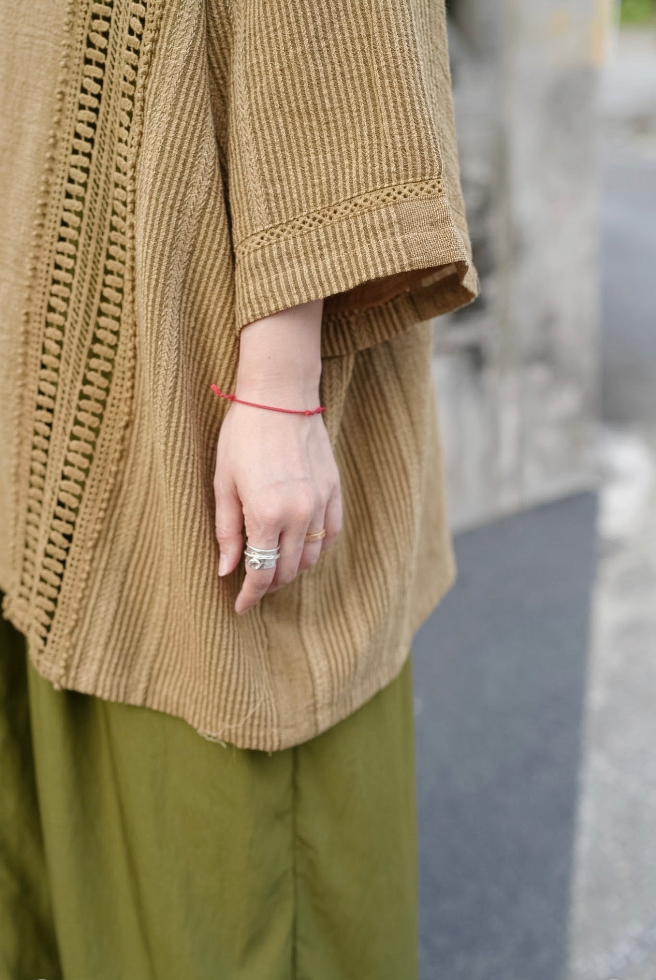 凹凸薄縐如麻質通爽!條紋布和 Lace 拼合使用編織